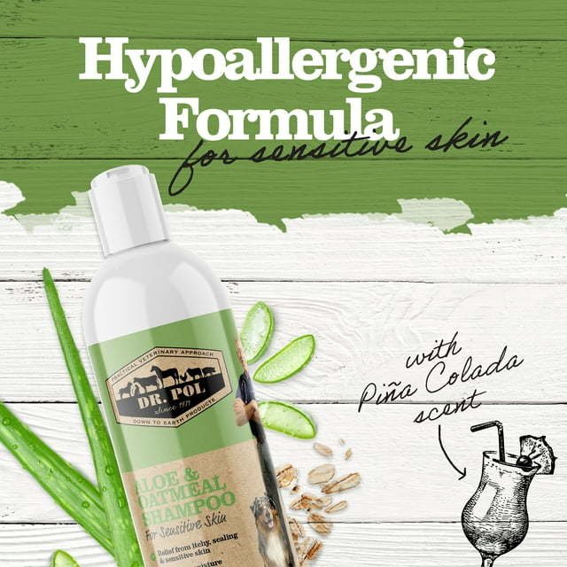About Dr. Pol Aloe Oatmeal Shampoo for Dogs and Cats Keep your pet feeling clean and smelling fresh with Dr. Pol Aloe Oatmeal Pet Shampoo for Dogs and Cats! This nourishing pet shampoo uses wholesome ingredients, such as aloe vera and oatmeal, to help add moisture to the skin. A regular bath with a moisturizing dog shampoo for sensitive skin can help relieve itchy skin and irritations. This cat and dog oatmeal shampoo for dry itchy skin also helps deodorize with a hypoallergenic formula and a pleasant pina colada scent. The wholesome ingredients in this pet shampoo means it has many uses, including a dog shampoo for dry skin, a cat dandruff shampoo, or even a puppy shampoo! For kittens and puppies 12 weeks and older, this cat and dog anti itch shampoo can aid in itch relief, dandruff reduction, and dry skin soothing. Dr. Pol shampoo for dogs with dry itchy skin is easy to use as well. Simply wet coat, lather up, let sit for 5 to 10 minutes, and rinse thoroughly. Each use of this deodorizing dog shampoo can help reduce bad pet odor by cleansing the coat. Add this anti itch shampoo for dogs and cats to your pet bathing routine now!