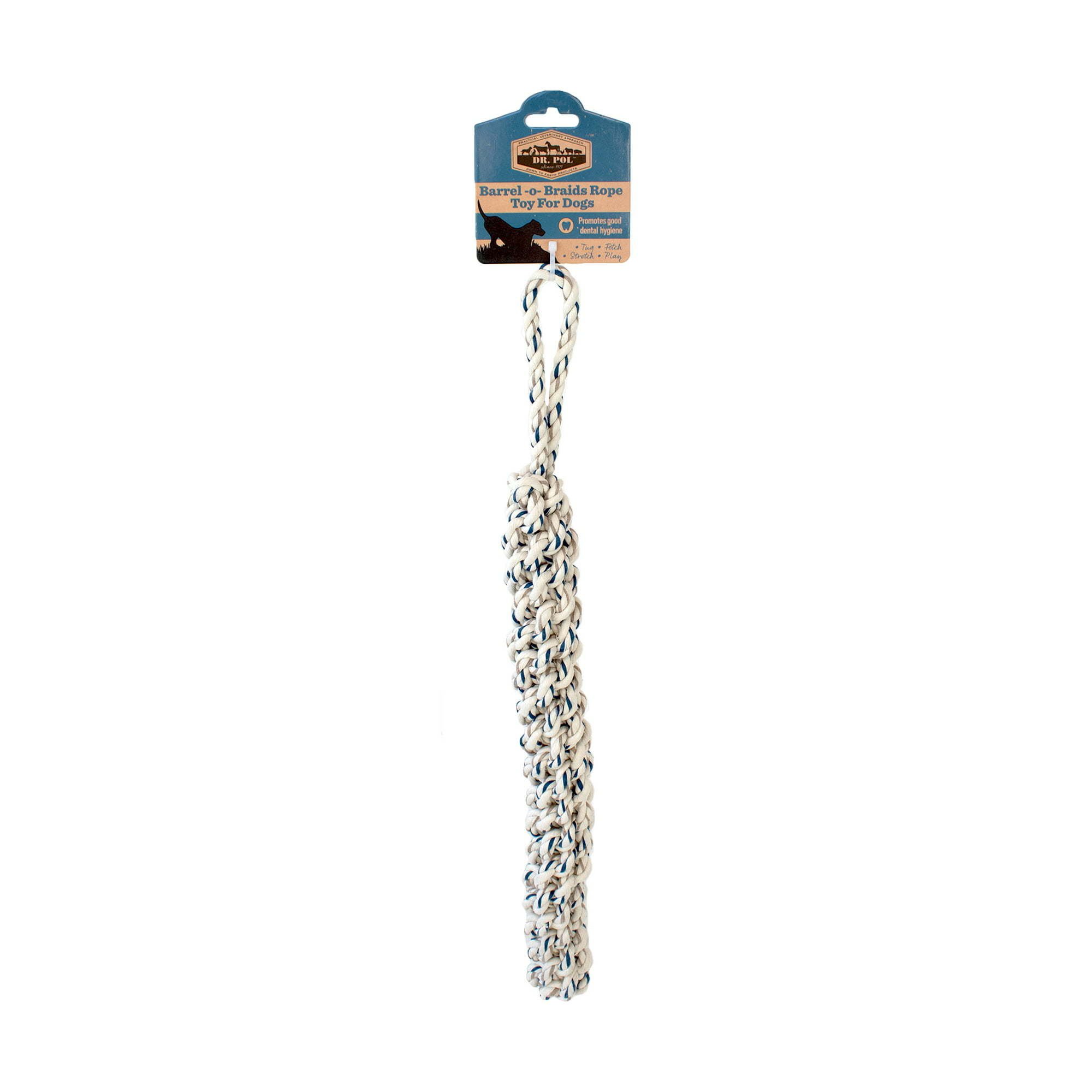 Dr. Pol Barrel O' Braids Rope Toy is a high quality dog toy that is interactive and engaging. The rope toy is made of twisted rope and is three braided strands wide. The Dr. Pol braided rope toy will give your dog all the rough and tough play for hours. The Dr. Pol dog toy is durable and is great for puppies that are teething and adult dogs who like to chew. The rope toy promotes good dental hygiene all while offering your dog fun play time. Dr. Pol has had a practical veterinary approach since 1971 and is the TV Host of #1 Veterinary Show on TV for over 20 seasons!